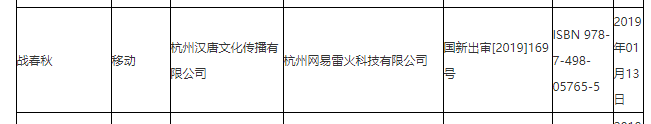 名单显示,《战春秋》由杭州汉唐文化传播有限公司出版,由杭州网易雷火科技有限公司运营。网易雷火官网显示,其为网易集团下属的内资公司,该公司产品包括《倩女幽魂2》、《天下3》等。