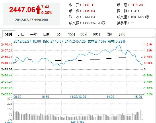 和讯股票消息 今日沪深两市全天呈冲高回落的走势,两市成交量大增。个股方面,午后中石油股价异动,盘中一度大涨逾2%。截至收盘,沪指报2447.06点,涨7.43点,涨幅0.3%,成交1446.9亿元;深成指报10177.33点,涨53.18点,涨幅0.53%,成交1272.9亿元。盘面上,仅保险、银行、建材等少数板块下跌,其余大多数板块上涨;其中电器、券商、物流运输等板块涨幅居前。