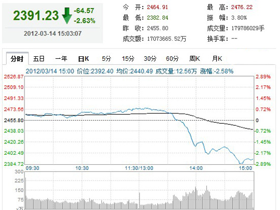 和讯股票消息 今日大盘早盘高开高走,深成指盘中创出新高,但受温家宝午间表示地产调控不动摇消息影响,午后开盘两市突然大幅跳水,地产、水泥板块领衔砸盘,大盘呈现“断崖式”走势。截至收盘,沪指报2391.23点,跌2.63%;深成指报10094.89点跌3.19%。板块全线飘绿,其中传媒娱乐、物联网、开发区、船舶制造、环保、水泥等板块跌幅居前。
