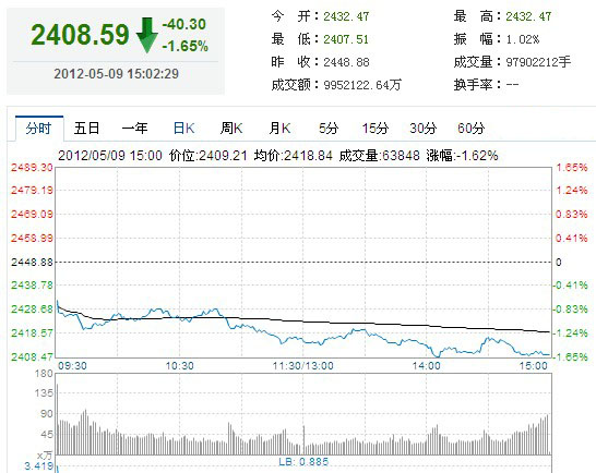和讯股票消息 受外围市场对希腊退出欧元区的担忧加重的利空影响,隔夜外围市场大幅调整,今日两市双双低开低走,沪深两市盘面板块大部分下跌。银行、券商、有色、煤炭、房产等权重板块悉数下跌,成为拖累市场下行的主要做空力量。两市酒店餐饮及非汽车交运板块维持小幅上涨。另外,受相关消息的刺激,西藏概念、航母概念、航天军工板块走出了可观的上扬行情。直至收盘,沪指报2408.59点,跌40.30点,跌幅1.65%。深成指报10294.58点,跌230.10点,跌幅2.19%。
