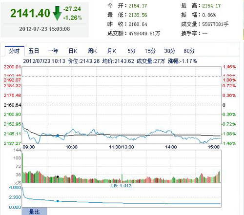 和讯股票消息 受上周五欧美股市集体大跌影响,7月23日早盘,沪深两市股指大幅低开。开盘后,两市股指在金融、房地产等权重的拖累之下,走出一波快速下跌行情。进而进入低位震荡格局。盘中,券商、传媒、港口、电子等板块欲行护盘之举,大盘跌幅一度收窄。但投资者信心丧失,热点散乱,最终无力回天。直至收盘,沪指跌27.24点,跌幅1.26%,报2141.40点,创半年以来新低。深成指跌147.19点,跌幅1.58%,报9186.02点。两市成交量较上一交易日略有缩小。