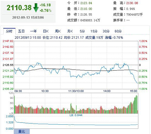 和讯股票消息 今日上证指数低开后,在低位震荡,尾盘直线跳水,沪指报收于2110.38点,下跌0.76%,成交790亿;深成指下跌1.09%,报收于8691.00点。