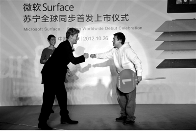 昨日凌晨,联想桥苏宁电器,微软大中华区董事长兼首席执行官贺乐赋与首位购买到Surface的顾客庆贺。新京报记者 李飞 摄