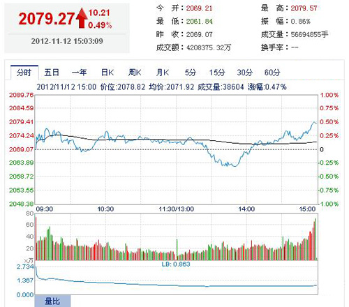 和讯股票消息 今日沪指微幅高开,在“美丽中国”概念股的带动下,早盘沪指最高至2079.57点,午后在地产和高铁板块的带动下沪指尾盘再度收高,截止收盘沪指报2079.27点,上涨10.21点或0.49%,成交420.84亿;深成指报8391.90点,上涨35.23点或0.42%,成交386.22亿。两市成交金额较上周五有所放大。