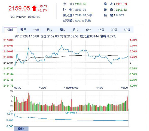 和讯股票消息 今日沪指小幅低开报2150.65点;深成指低开报8647.62点。上午多头三次拉升股指,拉升后资金供应不足,股指逐渐回落。总的来说上午多头还是略占上风,沪指午盘报涨0.48%。午后热点有所退潮,股指在没有进场资金支撑下,逐级下跌,沪指一度翻绿。截止收盘沪指报2159.03点,上涨0.27%,成交679.7亿;深成指报8631.37点,下跌0.31%,成交687.3亿。量能方面与上一交易日略有减少。
