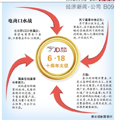 新京报讯 (记者刘夏 李媛)6月份的电商促销大战于今日步入最高潮。因6·18是京东店庆的正日子,其他电商也纷纷卡在这一时间点推出重磅活动,围剿京东之意明显。