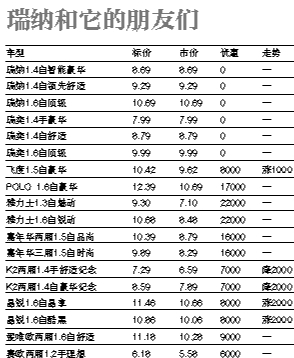 瑞纳竞争对手主要包括飞度、嘉年华和K2等。由于只是年度改款,因此瑞纳及瑞奕的上市并未给市场造成明显冲击,多数竞争车型的价格仍维持不变,仅有少量车型价格稍有起伏。其中,相比1个月前,飞度价格上涨了1000元,一位销售顾问介绍,由于现车较少,同时新飞度将于北京车展上市,因此现款飞度价格小有回升。此外,晶锐价格近期上涨了2000元左右,东风悦达起亚K2优惠幅度增加了2000元。