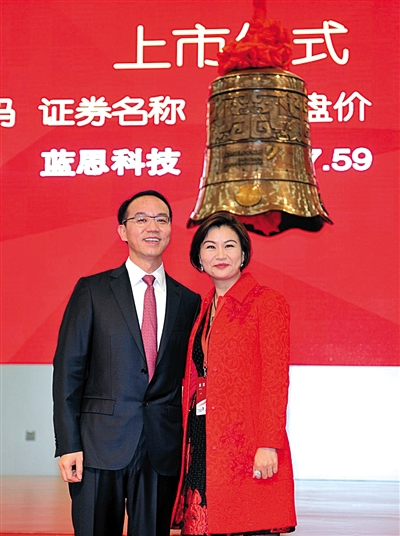2015年3月18日,深圳,蓝思科技在深圳证券交易所创业板上市交易,周群飞、郑俊龙夫妇参加敲钟仪式。图/CFP