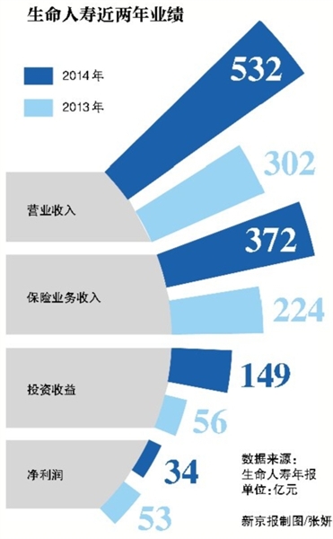 从年报看,生命人寿2014年实现营业收入532.73亿元,同比增长76.3%;投资收益为149.55亿元,同比增长162.9%。