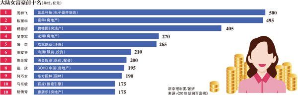 新京报讯 (记者梁薇薇)继10月15日发布《2015胡润百富榜》之后,10月19日,胡润研究院发布胡润百富榜子榜之一《2015胡润女富豪榜》及《2015胡润全球白手起家女富豪榜》。榜单显示,蓝思科技董事长周群飞以财富500亿元成为大陆新一届“女首富”。