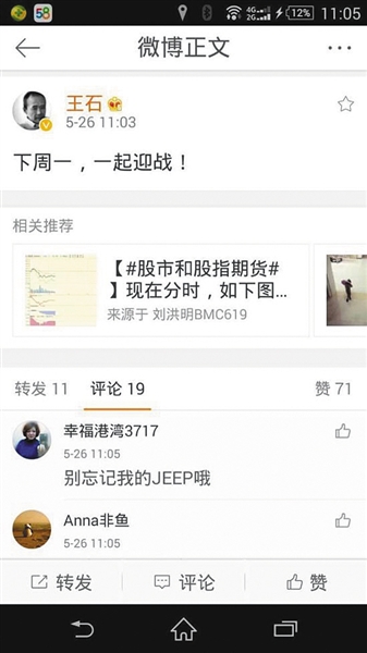 新京报记者昨日从万科集团获悉,王石微博内容系为金蝶公司在下周一的一场活动助威,与复牌无关。王石再度发微博澄清:“下周一老朋友要发布新产品,让老王给他站个台。互联网时代,机遇挑战并存。”