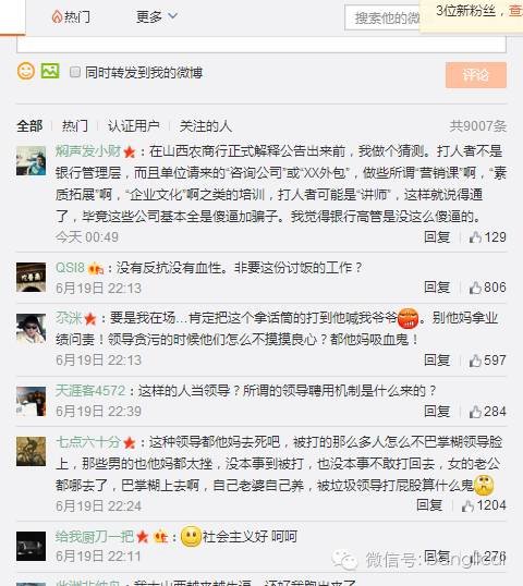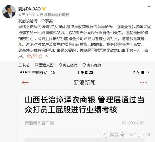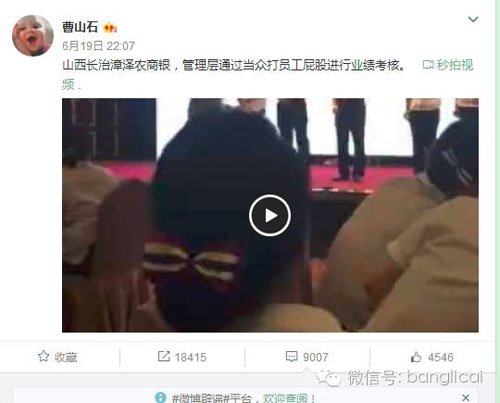 昨日,微博大V@曹山石报料一份“山西长治漳泽农商银管理层通过当众打员工屁股进行业绩考核视频。”
