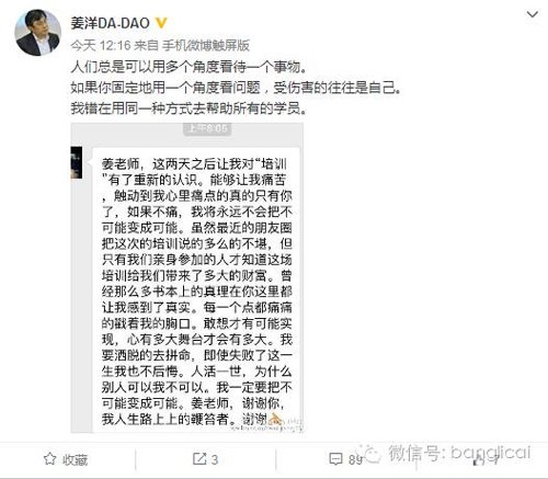 理财帮帮主查阅姜洋微博发现,他经常接收到所谓学员的来信,比如,在今日中午12点16分,他发出一条微博称,人们总是可以用多个角度看待一个事物。如果你固定地用一个角度看问题,受伤害的往往是自己。我错在用同一种方式去帮助所有的学员。