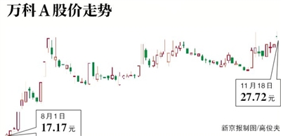 交易行情显示,万科A在11月18日的收盘价为27.72元,涨幅2.67%;而受到恒大持续增持的利好,万科A曾在11月10日创造了今年28.28元/股的新高。