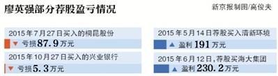 其买入金额最大的个股为“清新环境”。廖英强在2015年5月14日中午休市期间,在其栏目视频中推荐了“清新环境”,其控制的账户于荐股前买入“清新环境”,买入金额4741万元,荐股后卖出906100股,卖出金额3901万元,盈利191万元。
