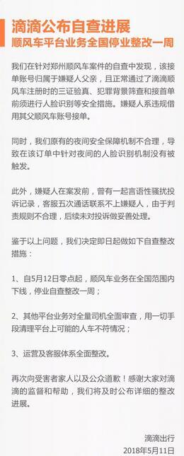 空姐遇害事件发生之后,公众开始质疑滴滴平台对顺风车审核不严的问题。滴滴公司在昨日公布自查结果,承认平台存在监管漏洞,宣布顺风车平台业务全国停业整改一周。该嫌疑人系违规使用其父的顺风车账号接单,在案发前就因言语性骚扰而被投诉,但滴滴并未对投诉做妥善处理。