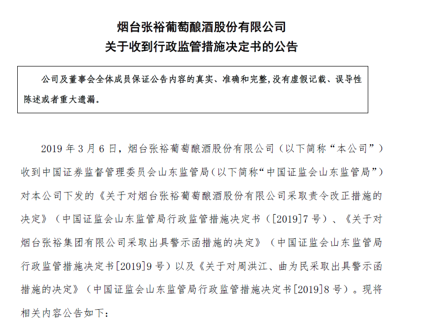 而对于张裕集团违背承诺的行为,山东证监局决定对其采取出具警示函的监管措施,并记入证券期货市场诚信档案。同时,由于张裕公司时任总经理周洪江、董事会秘书曲为民未能勤勉尽职,决定对两人采取出具警示函的监管措施,并将相关情况按规定记入证券期货市场诚信档案。