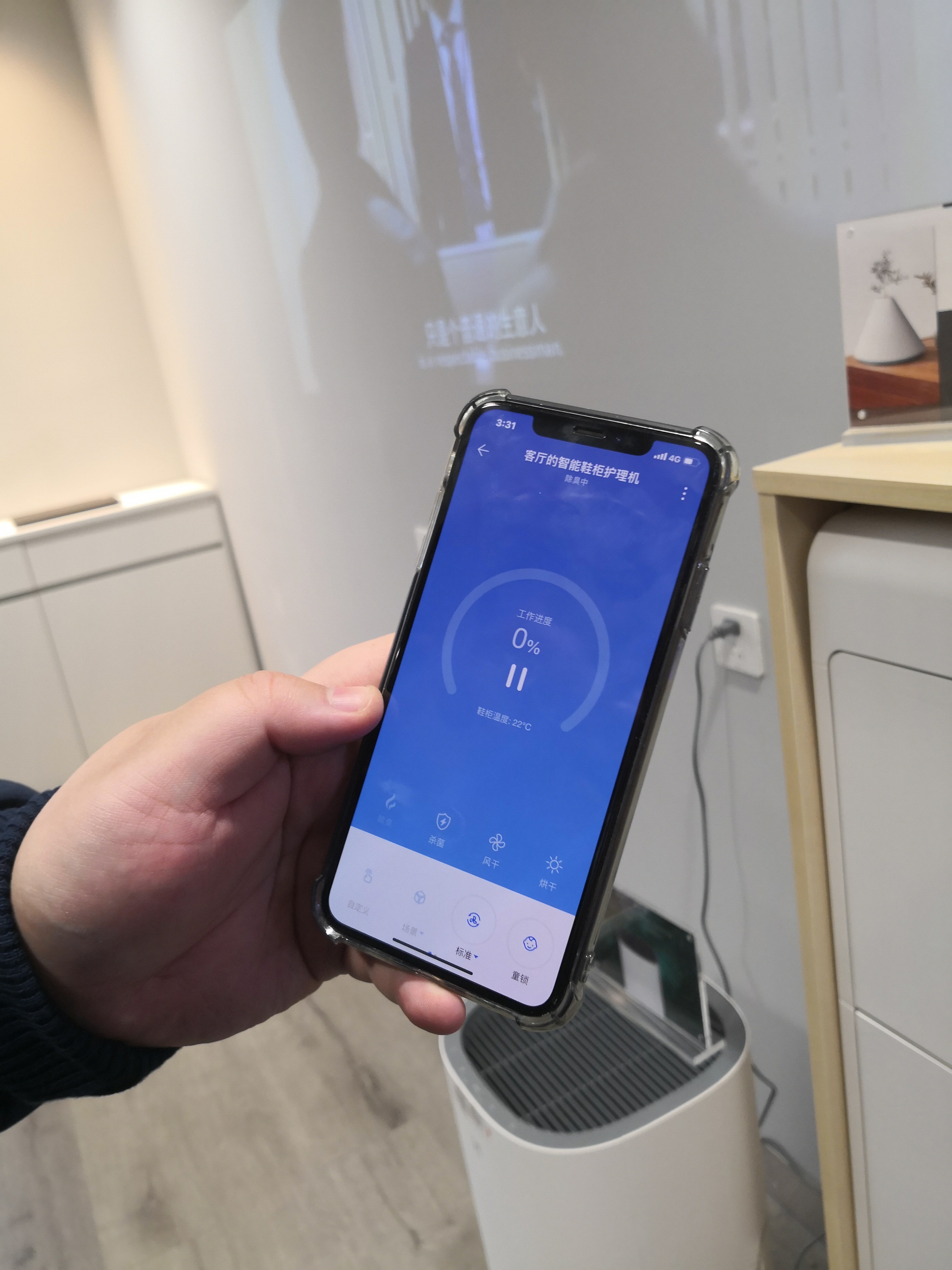 居然之家北京北四环店HUAWEI HiLink体验店,工作人员展示如何用智能手机控制鞋柜护理机。摄影/新京报记者 冯静