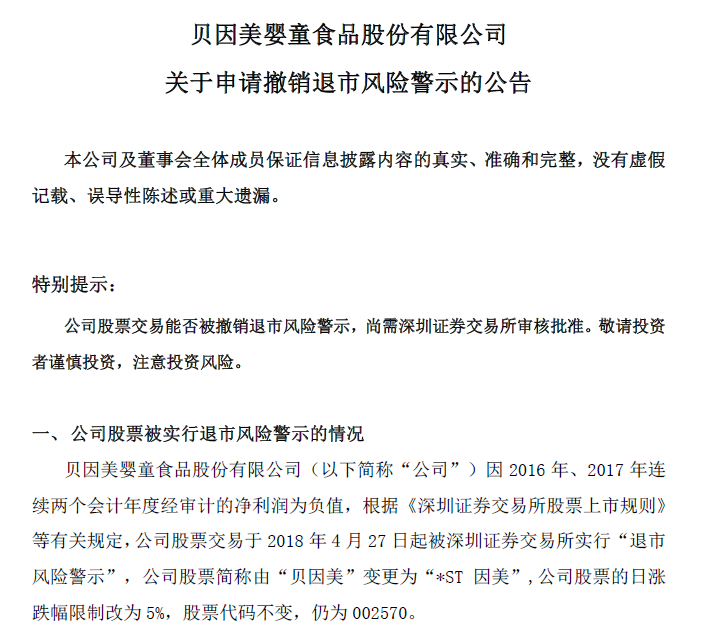 新京报讯(记者 郭铁)扭亏为盈的*ST因美3月31日发布公告称,公司已于3月29日向深交所提交撤销退市风险警示的申请。如获批准,其证券简称将由“*ST因美”变更为“贝因美”,日涨跌幅限制由5%恢复为10%。