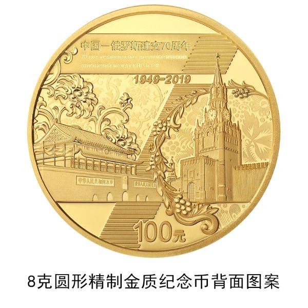8克圆形金质纪念币背面图案为天安门、装饰牡丹花造型与俄罗斯克里姆林宫、装饰花楸枝造型等组合设计,并刊“中国-俄罗斯建交70周年”中、俄文等字样及面额。