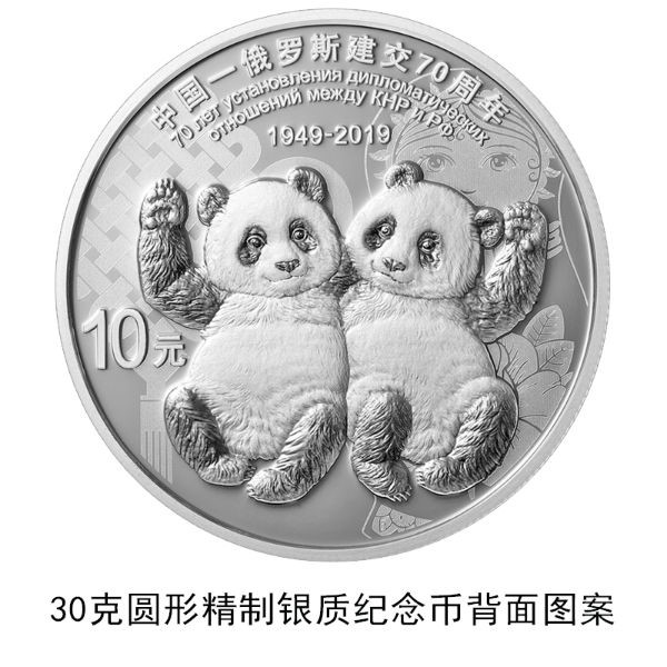 30克圆形银质纪念币背面图案为两只熊猫,辅以中国结、俄罗斯套娃装饰图案组合设计,并刊“中国-俄罗斯建交70周年”中、俄文等字样及面额。