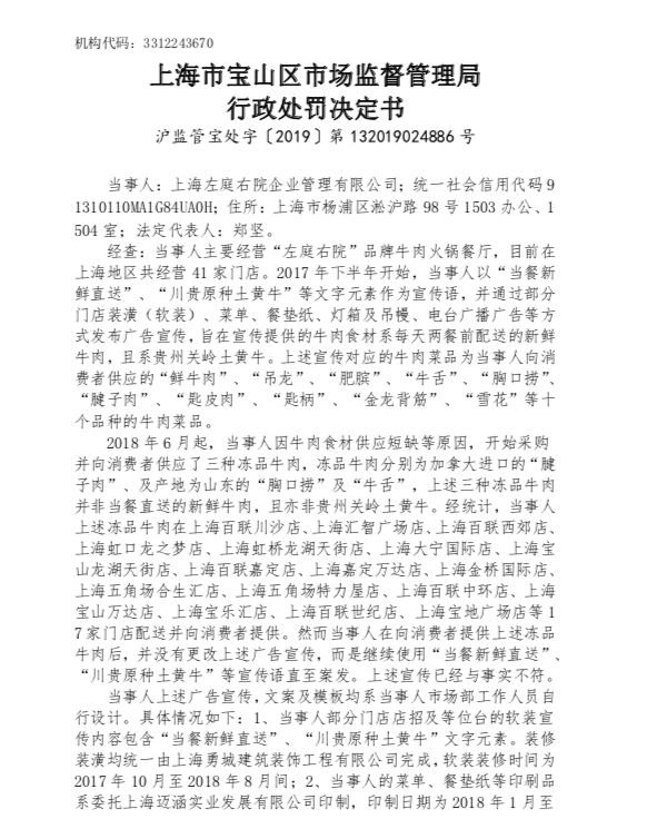 记者查阅相关资料发现,6月6日,上海市宝山区市场监督管理局对左庭右院作出处罚。根据处罚决定书,当事人即上海左庭右院企业管理有限公司主要经营“左庭右院”品牌牛肉火锅餐厅,目前在上海地区共经营41家门店。2017年下半年开始,左庭右院以“当餐新鲜直送”、“川贵原种土黄牛”等文字元素作为宣传语,并通过部分门店装潢(软装)、菜单、餐垫纸、灯箱及吊幔、电台广播广告等方式发布广告宣传,旨在宣传提供的牛肉食材系每天两餐前配送的新鲜牛肉,且系贵州关岭土黄牛。上述宣传对应的牛肉菜品为当事人向消费者供应的“鲜牛肉”、“吊龙”、“肥膑”、“牛舌”、“胸口捞”、“腱子肉”、“匙皮肉”、“匙柄”、“金龙背筋”、“雪花”等十个品种的牛肉菜品。