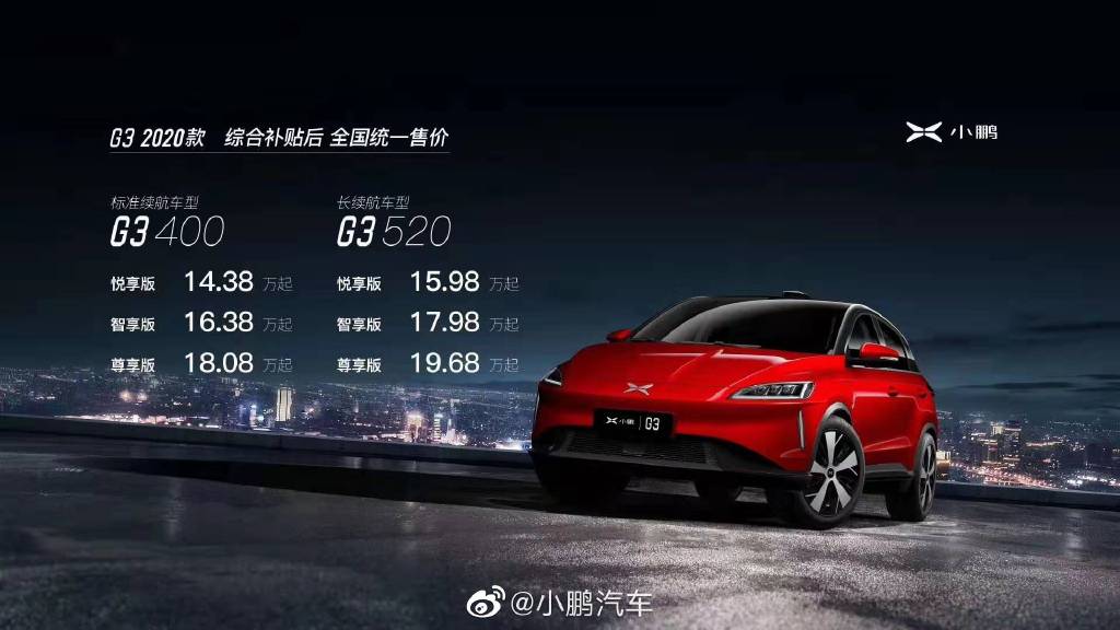 新京报讯(记者 陆一夫)在实现1万辆G3下线的目标后,小鹏汽车随即推出改款车。7月10日,小鹏宣布推出G3 2020 款,分为综合工况续航里程 401 公里的 G3 400 和 520 公里的 G3 520 两个版本。这两个版本均有悦享、智享和尊享三种配置,其中401公里版本的对应售价分别为14.38万元、16.38万元和18.08万元,520公里版本的售价为15.98万元、17.98万元和19.68万元,预计将于8月底分批交付。