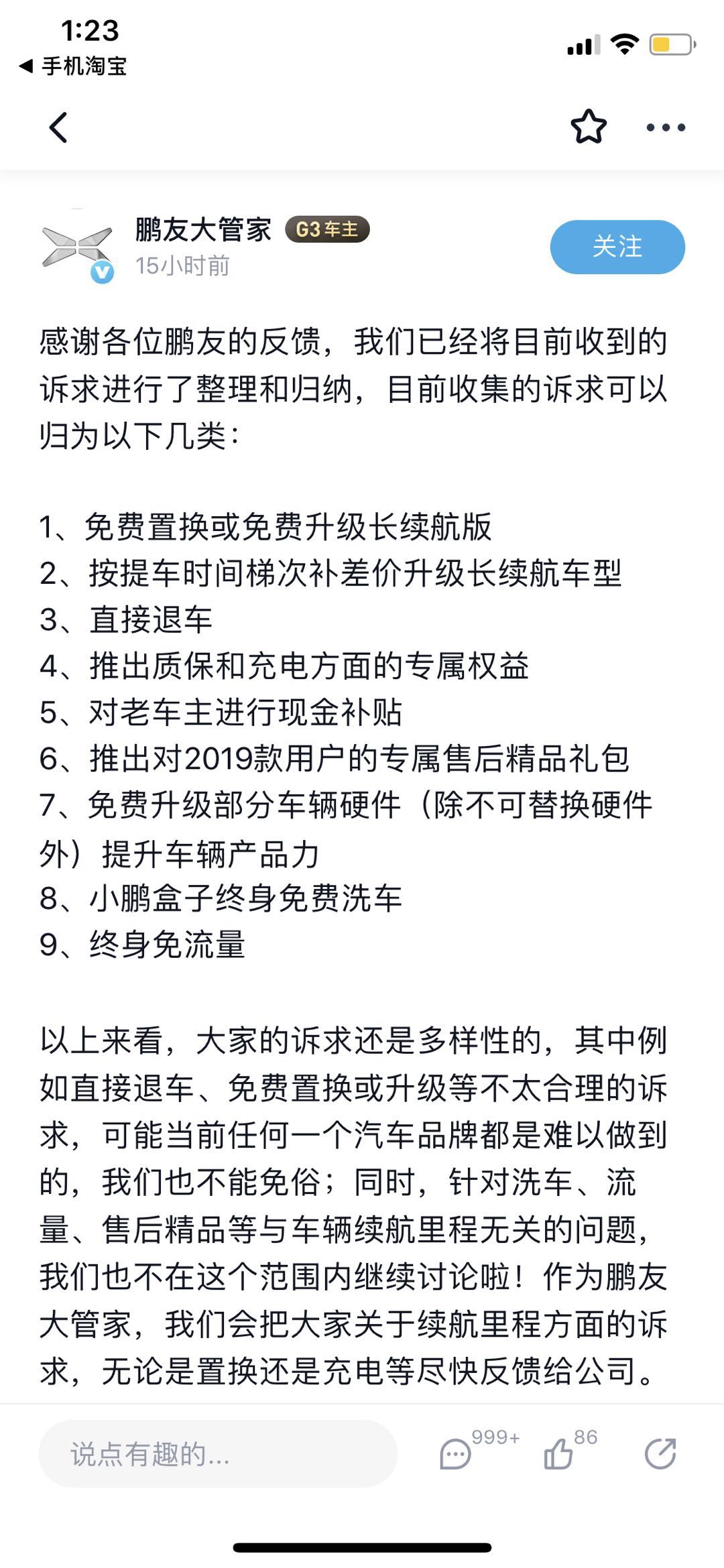 有部分车主要求小鹏汽车免费升级旧版G3的电池,不过值得注意的是,小鹏G3原本一直采用圆柱电池做电池包,电池pack供应商是欣旺达,电芯供应商则是比克,而G3 2020 款则是搭载宁德时代的新一代方形三元锂电池,这一诉求难以达成。