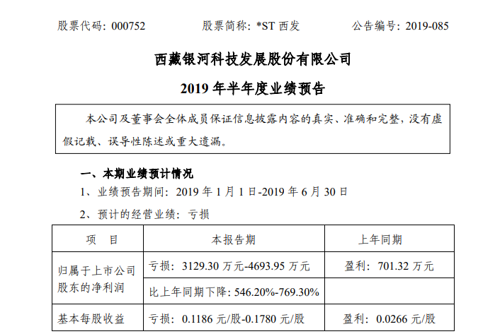新京报讯(记者 王子扬)7月14日晚间,拉萨啤酒母公司西藏银河科技发展股份有限公司(简称“*ST西发”)发布业绩预告显示,今年上半年净利润为亏损3129.30万元至4693.95万元,同比下降546.20%至769.30%,而去年同期净利润为701.32万元。根据*ST西发的解释,此次净利润下跌主要与之前的借款和违规开出的商业承兑汇票有关。其子公司拉萨啤酒的营收、净利润也同比下降。