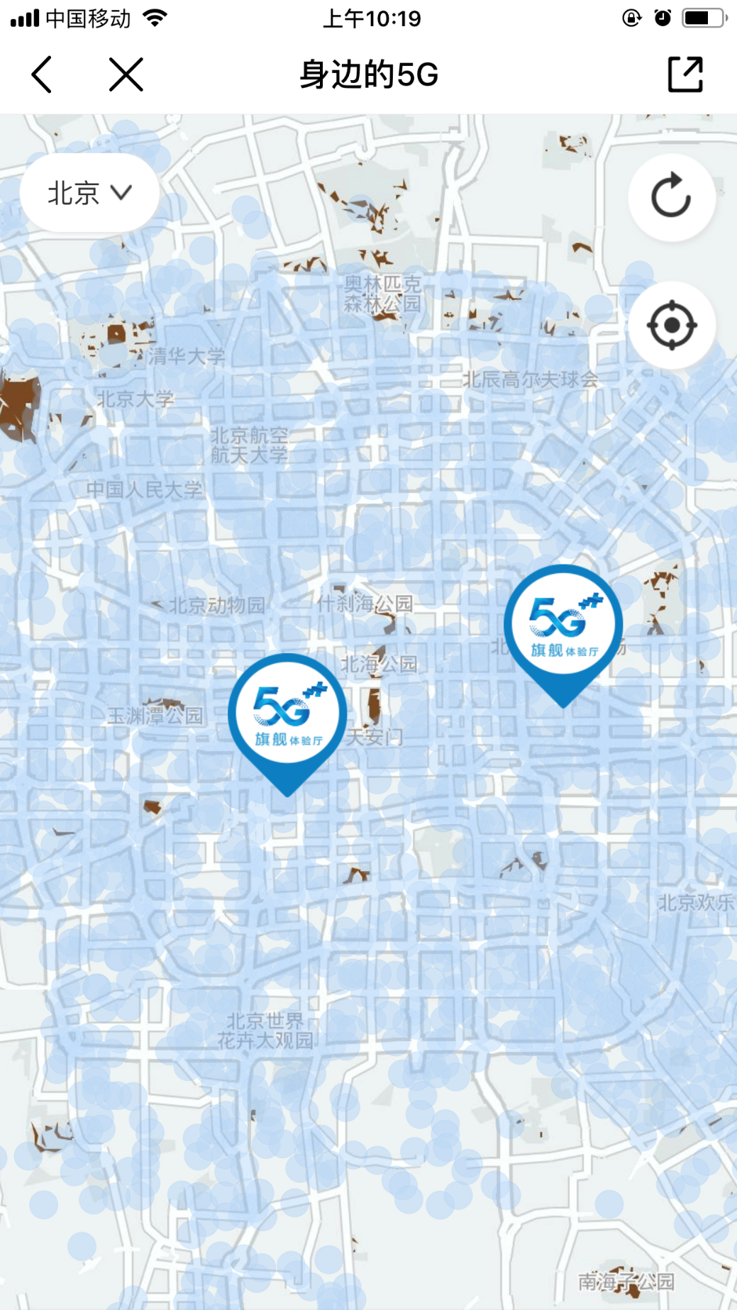 新京报记者从中国移动手机APP上查询到北京5G基站的开通情况,图中可以看到,北京五环内的5G覆盖已经密密麻麻。中国移动董事长杨杰在今年6月宣布的目标是,在今年实现超过50座城市的5G商用服务。