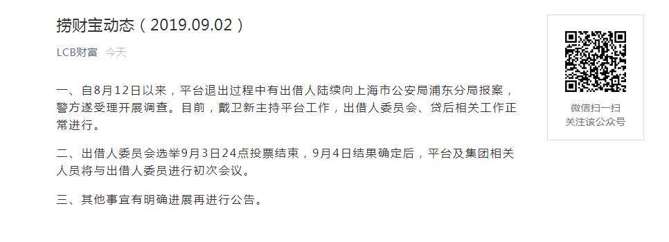 新京报讯(记者 黄鑫宇 陈鹏)9月2日,上海网贷平台捞财宝公号对外发布消息称,目前,戴卫新主持平台工作,出借人委员会、贷后相关工作正常进行。这是继昨天上海警方宣布以非法吸收公众存款罪对“证大系”公司立案调查后,关于“证大系”公司及其高管等涉案人员的最新动态(如图1所示)。