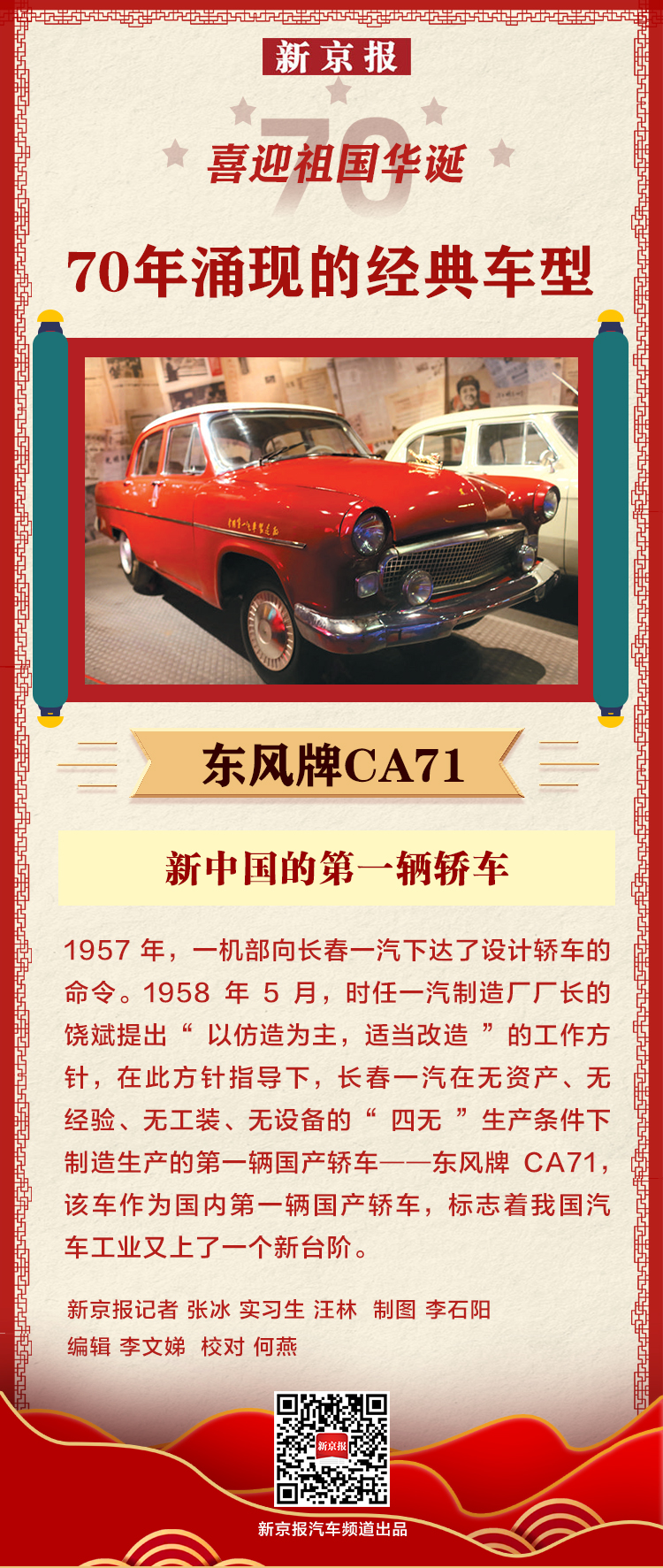 1957年,一机部向长春一汽下达了设计轿车的命令。1958年5月,时任一汽制造厂厂长的饶斌提出“以仿造为主,适当改造”的工作方针,在此方针指导下,长春一汽在无资产、无经验、无工装、无设备的“四无”生产条件下制造生产的第一辆国产轿车——东风牌CA71,该车作为国内第一辆国产轿车,标志着我国汽车工业又上了一个新台阶。