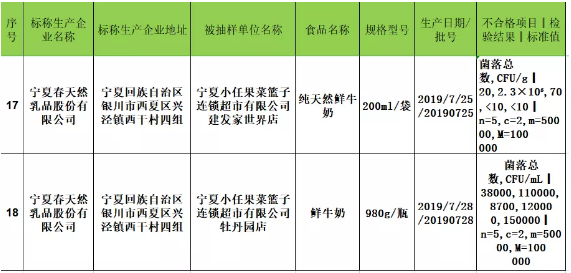 通报显示,标称宁夏春天然乳品股份有限公司生产的1批次纯天然鲜牛奶(200ml/袋,2019-07-25)及1批次鲜牛奶(980g/瓶,2019-07-28)菌落总数超标。针对产品不合格原因,截至发稿,新京报记者尚未能与春天然乳品取得联系。