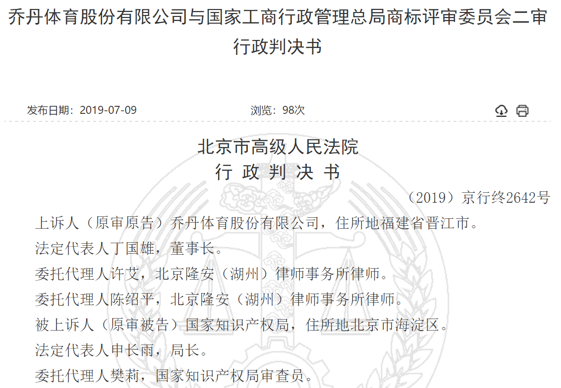 以北京市高级人民法院(下称“北京高院”)行政判决书(2019)京行终2642为例,上诉人(原审原告)为乔丹体育股份有限公司,被上诉人(原审被告)为国家知识产权局,落款日期为2019年6月20日。