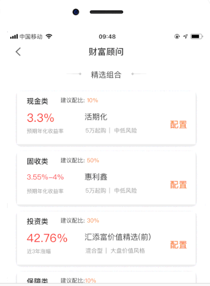 比如,在“理财”板块,客户可一键连接智能财富顾问(如下图所示)。其在为客户诊断资产风险之后,会提供专业的配置方案。
