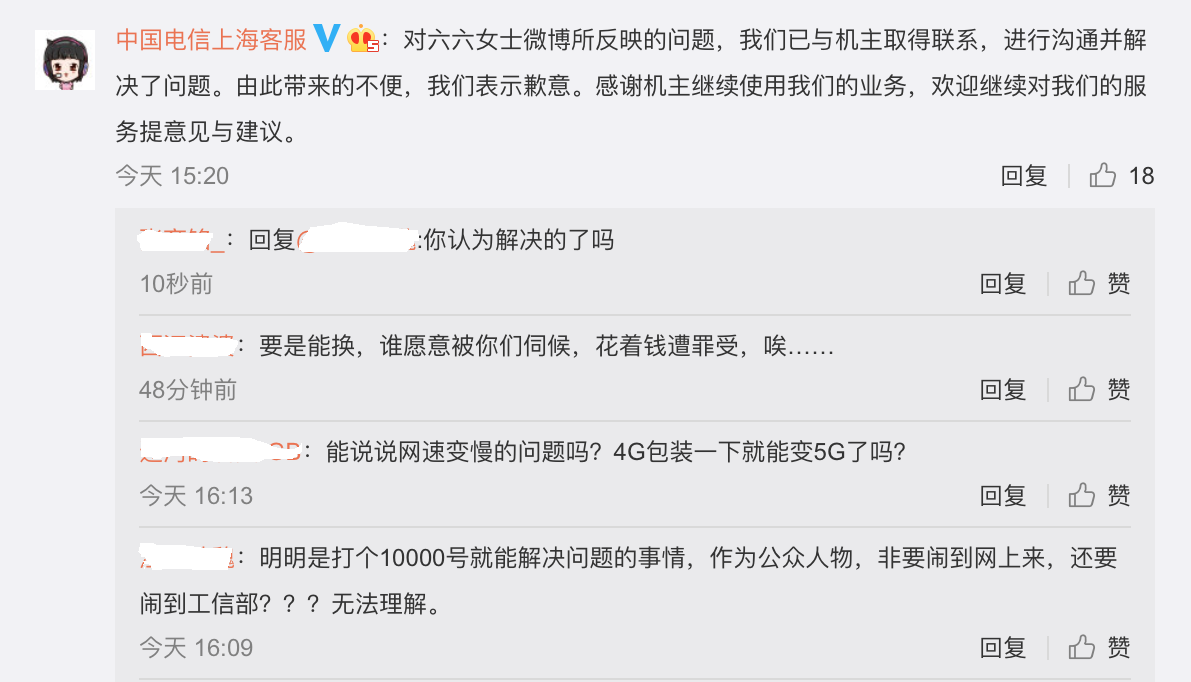 截至记者发稿前,六六尚未在微博上表示问题已经解决,记者询问情况的私信也未获得其回复。不过,新京报记者在六六的投诉微博下看到,“中国电信上海客服”认证机构账号在今天下午发布评论称,“对六六女士微博所反映的问题,我们已与机主取得联系,进行沟通并解决了问题。由此带来的不便,我们表示歉意。感谢机主继续使用我们的业务,欢迎继续对我们的服务提意见与建议。”