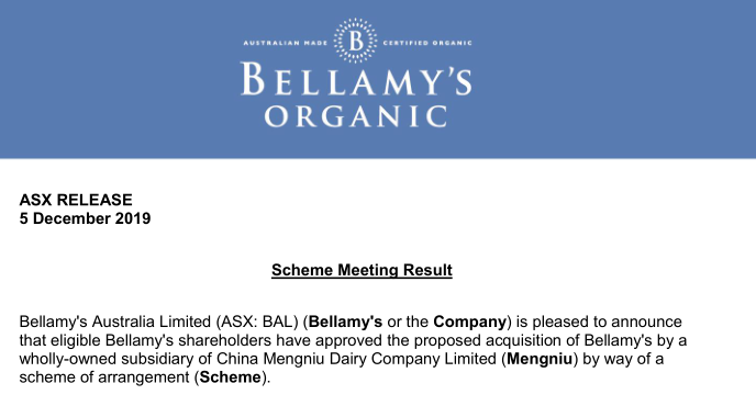 当地时间12月5日,贝拉米就此次交易连发3份公告。在当天举行的股东大会上,出席大会的符合条件股东中有82.88%投出赞成票,合计有99.23%的投票赞成收购决议,同意蒙牛每股13.25澳元的收购报价。