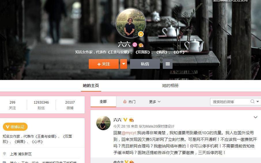 新京报讯(记者 许诺 陈维城)12月6日晚间,著名作家六六向新京报记者表示,她在微博上投诉中国电信的问题“完全没有解决”。“解决不能靠单方面表态。不是说你这次给我开通网就算解决了,也不是说你给我个人开通不断网就解决了,能不能体谅一下广大用户,不用这么粗暴的方式?”六六向新京报记者表示。