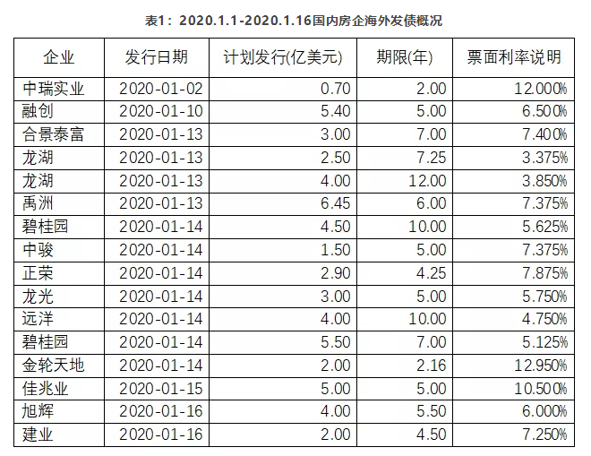 龙湖集团等房企海外融资利率较低。1月6日,龙湖集团宣布,成功发行6.5亿美元票据。其中,2.5亿美元期限为7.25年,票面利息为3.375%;4亿美元期限为12年,票面利息为3.85%。