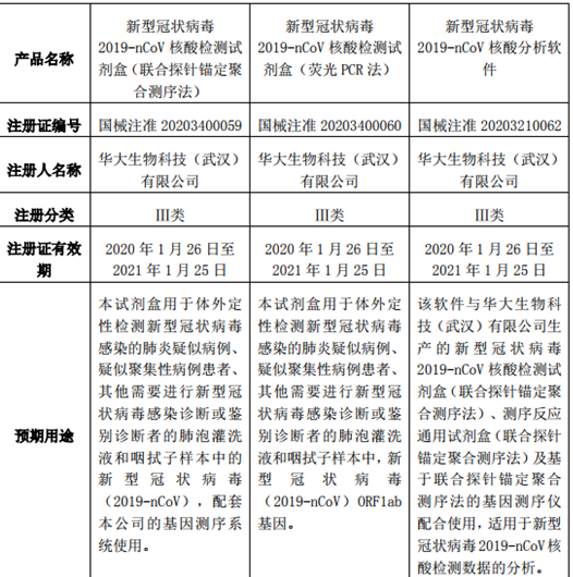 根据公告,华大基因旗下取得医疗器械注册证的产品分别为“新型冠状病毒2019-nCoV核酸检测试剂盒(联合探针锚定聚合测序法)”、“新型冠状病毒2019-nCoV核酸检测试剂盒(荧光PCR法)”、“新型冠状病毒2019-nCoV核酸分析软件”,有效期均为2020年1月26日至2021年1月25日。