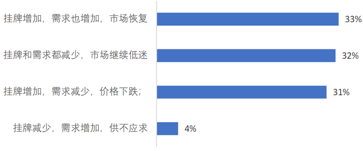 调查中,约64%受访者认为,疫情过后房源库存将有所增长,63%受访者认为,市场在疫情过后仍将持续低迷。同时,80%受访者认为一季度市场交易量将下滑,约1/3受访者认为市场交易量将下跌50%以上。