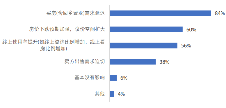 与此同时,在购房层面可能出现的情况是,消费者购房需求延迟,话语权提升,而议价空间也将扩大。超80%的受访者认为,购房者可能将因无法看房、市场前景不明朗而暂停买房,从而导致暂停售房为主流。同时,60%受访者认为,疫情将提升买方话语权,卖方的议价能力减弱,议价空间将有所扩大。