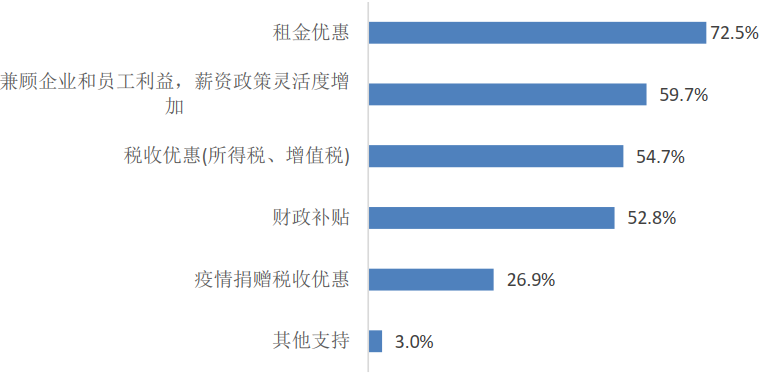 面对现金流吃紧、人员流失加剧的经营困境,72.5%的房产经纪机构期望获得明确的租金优惠政策;59.7%的经纪机构希望得到与员工可协商的灵活薪资政策支持,按比例或延迟发放,在提供员工一定薪资保障的基础上降低人工成本支出;而54.7%的经纪机构希望得到企业所得税、房产税等优惠。此外,在其他情形中,月供延缓、提供经营贷成为主要诉求。