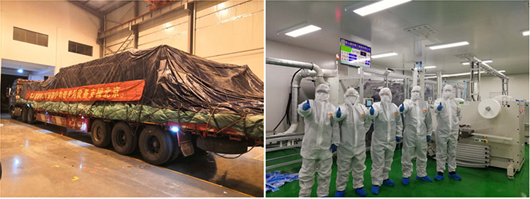 左图:生产线从富田精工装车出发。右图:设备运抵联合益康(北京)生物科技有限公司的生产车间。