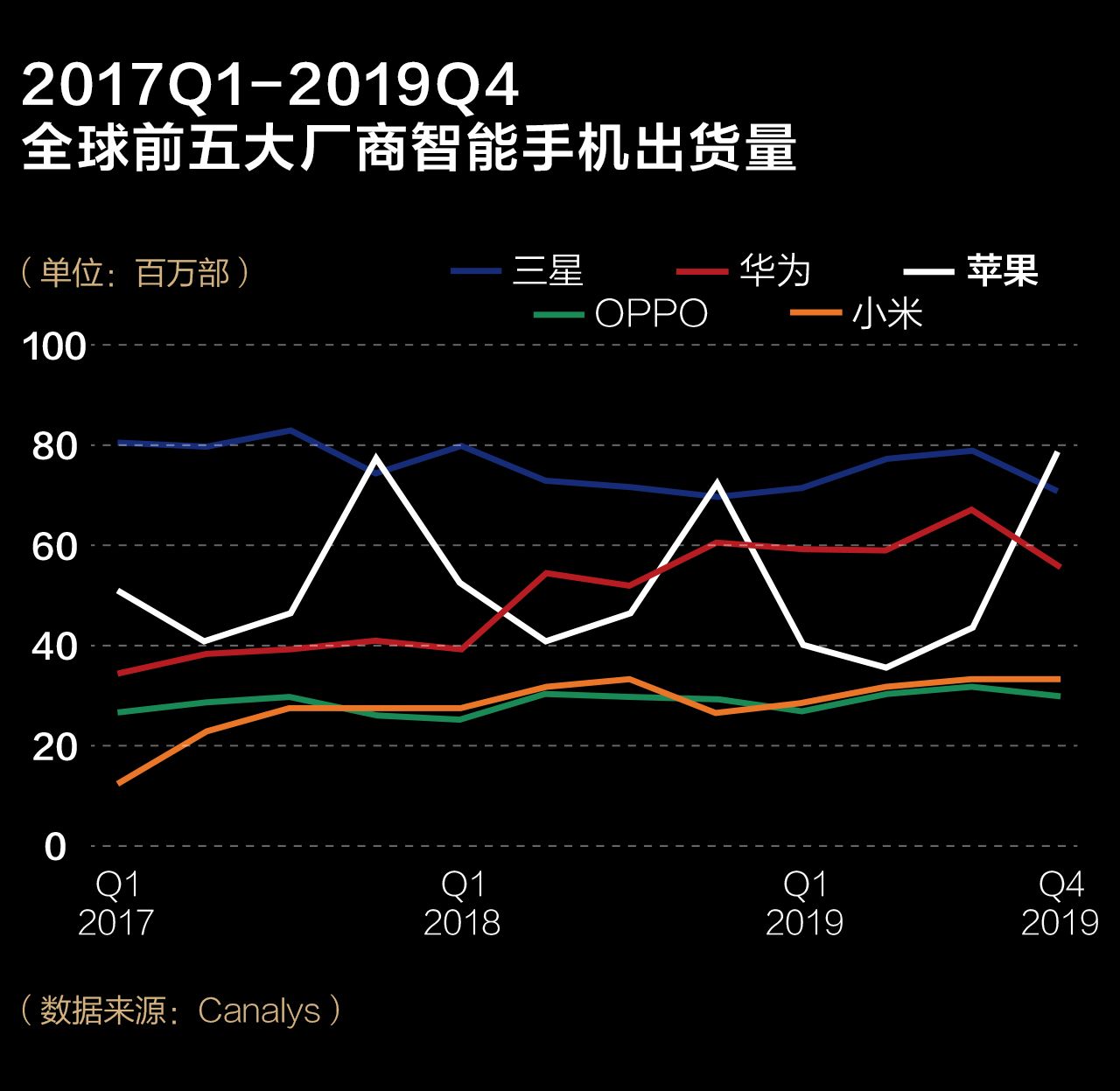 值得指出的是,2019年第四季度,华为和小米增速有着明显的区别——华为因“实体清单”打击导致智能手机在海外市场的销量下降,四季度整体出货量增速只有1%,而小米同期增速却高达23%。此外,由于9月发布新一代iPhone,苹果去年第四季度的出货量增长明显,反超三星和华为。
