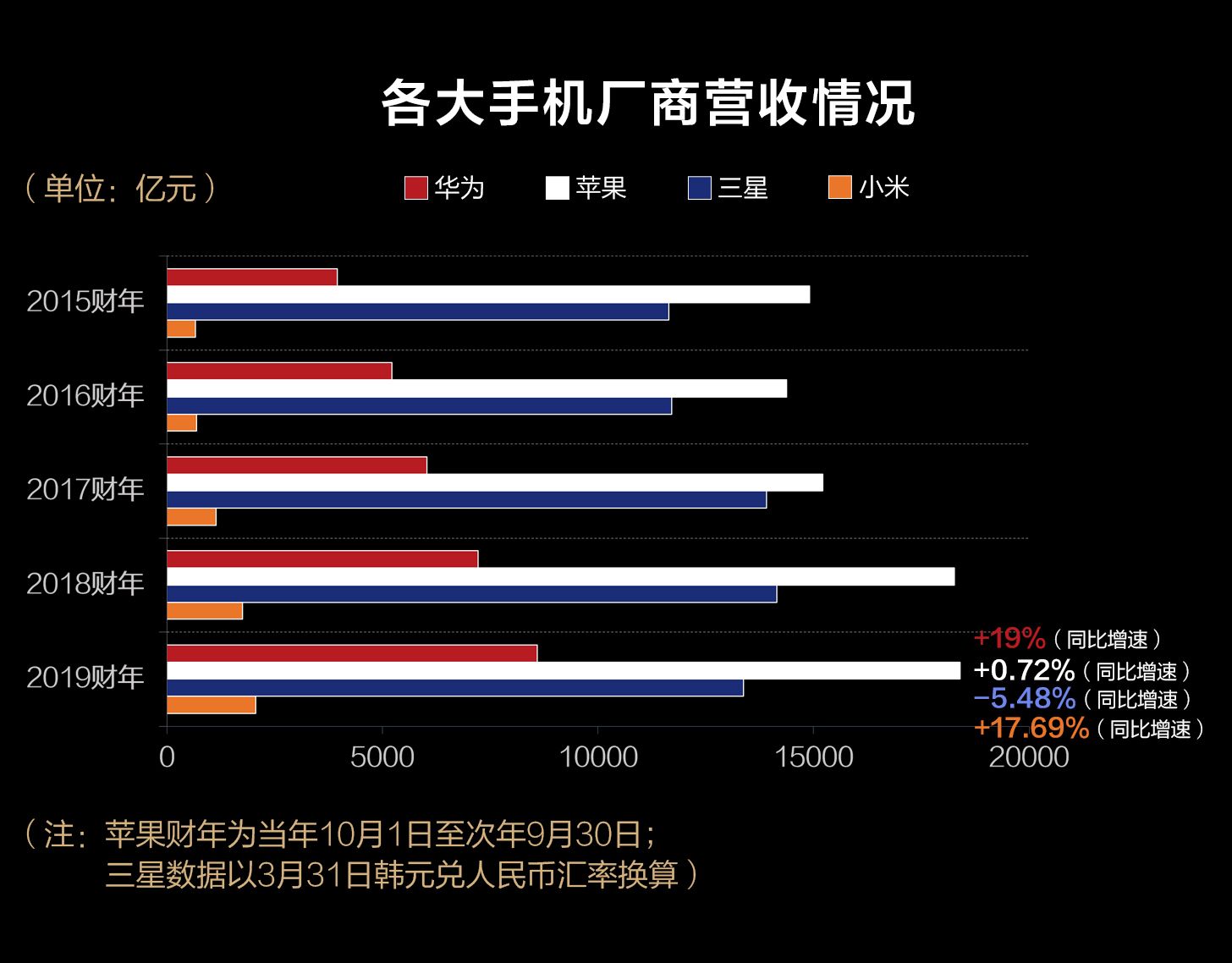 2019财年,苹果的营收达1.84万亿人民币,三星、华为、小米的营收分别为1.337万亿、8588亿和2058.39亿元。
