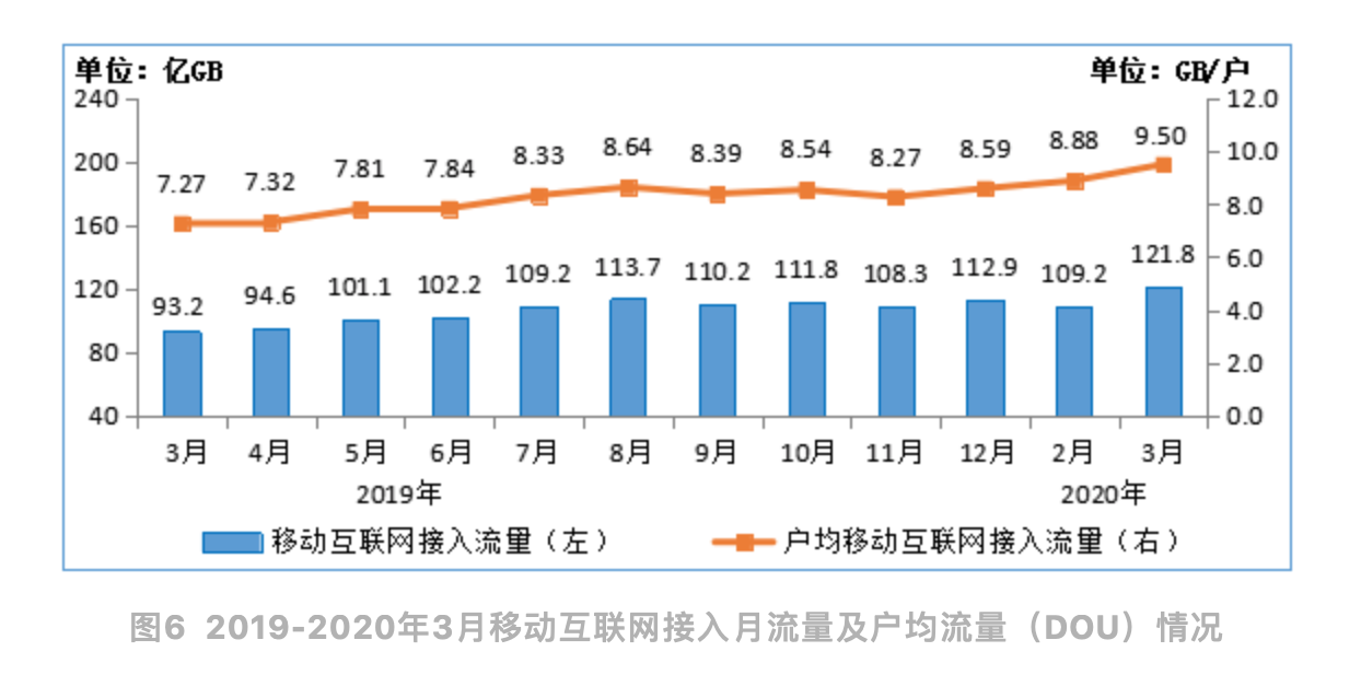 许诺)4月21日,工信部运行监测协调局公布了2020年一季度通信业经济运行情况。数据显示,一季度,移动互联网流量保持快速增长,累计流量达357亿GB,同比增长39.3%;3月当月户均移动互联网接入流量(DOU)达到9.5GB/户,同比增长30.6%,较上年12月提高0.91GB/户,达到近12个月以来最高点。