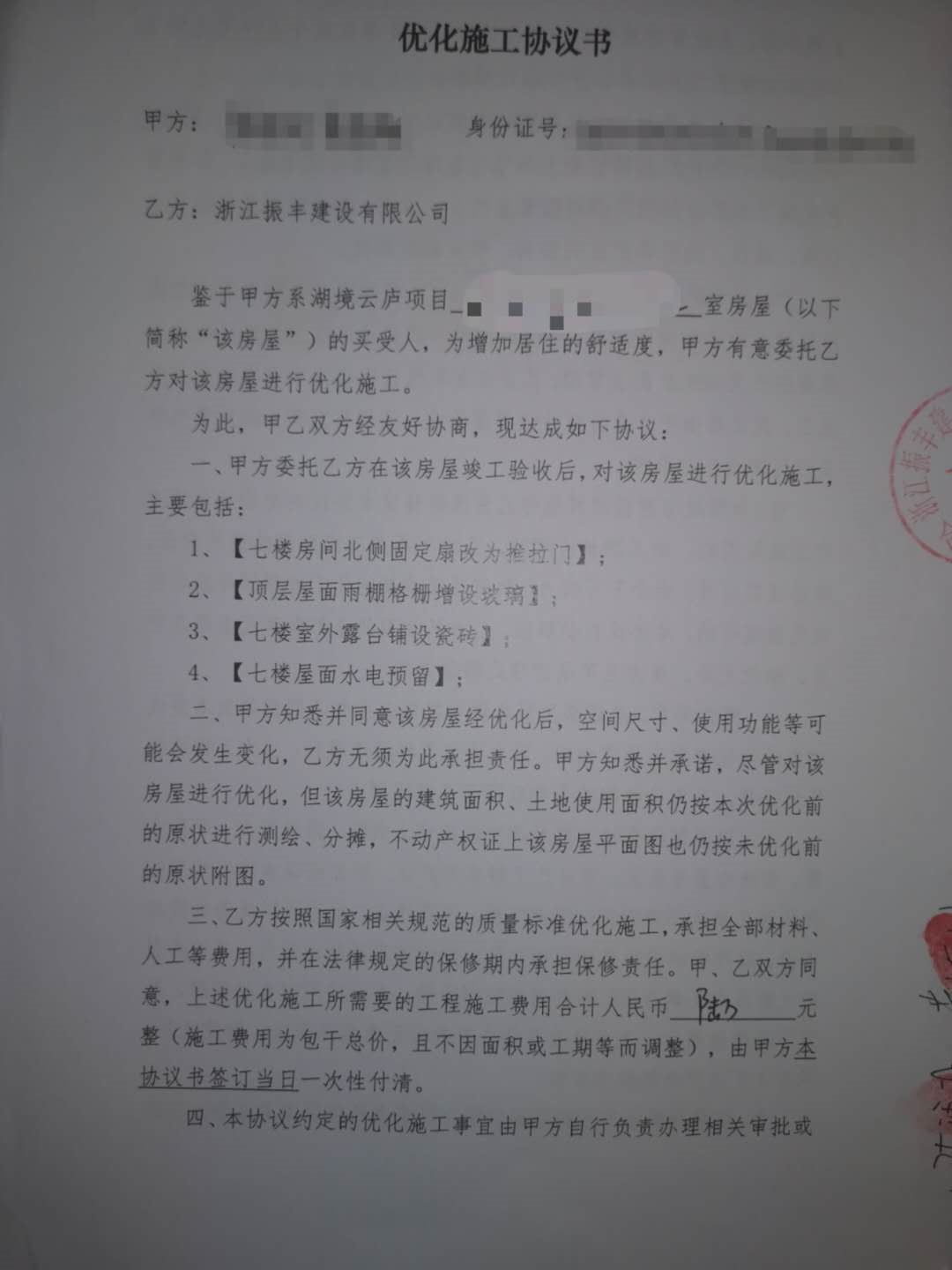 除了装修缩水等问题之外,李浩还对新京报记者说,“开发商的销售人员还在项目售楼处要求我签订了一个优化施工协议书,并向第三方公司交了约6万元费用。另有邻居最多向第三方公司交了22万元费用,我们认为这是不合理的收费”
