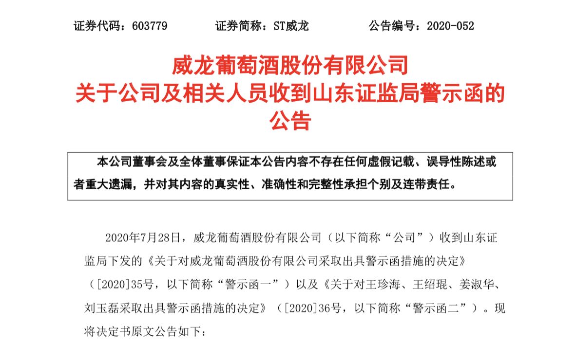 新京报讯(记者 薛晨)继上交所对威龙葡萄酒股份有限公司(以下简称“ST威龙”)的实际控制人王珍海以及有关责任人进行纪律处分之后,7月29日消息显示,ST威龙及相关人员还收到了山东证监局下发的两封警示函,对ST威龙存在违规担保事项且未按规定披露,以及未按期完成股份回购两件事予以警告。