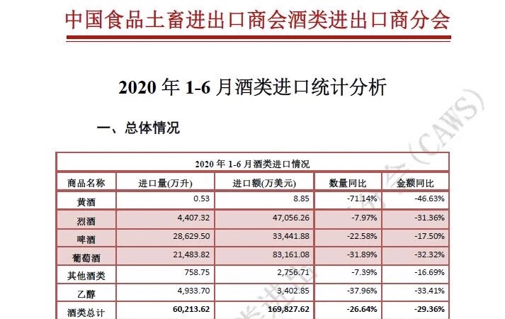 8月4日,中国食品土畜进出口商会酒类进出口商分会发布2020年1月-6月酒类进口数据。2020年上半年,进口酒类市场持续弱势运行,量额降速略减缓。